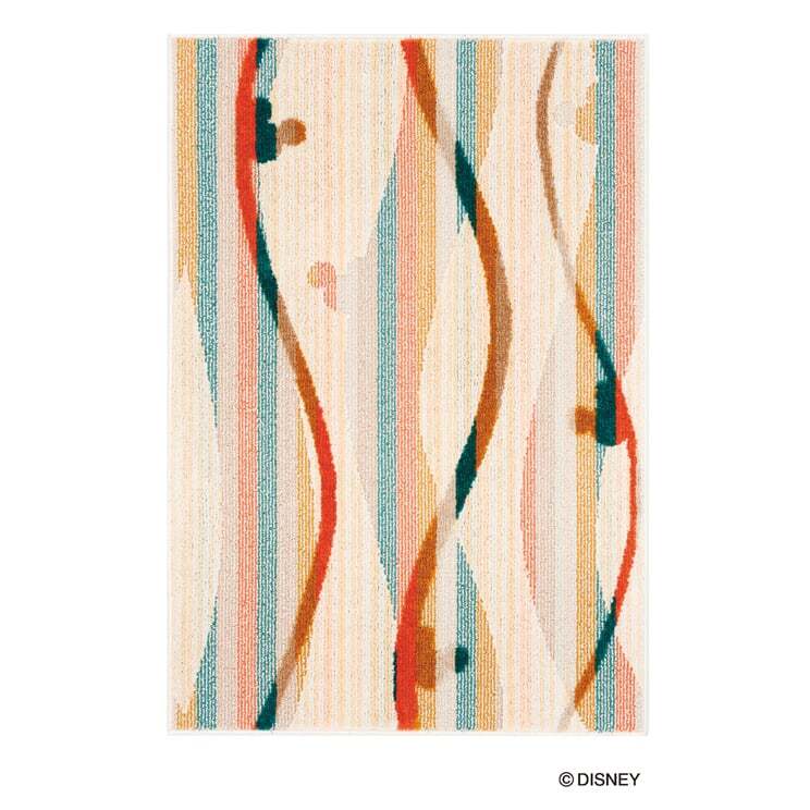 緩やかに描かれるカラフルなラインにミッキーのシルエットが描かれたラグ。