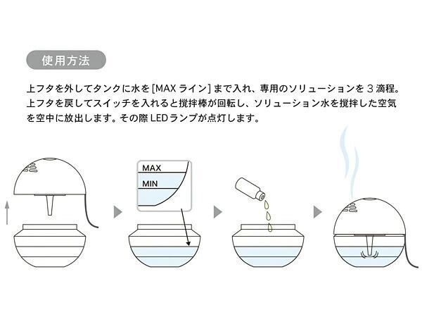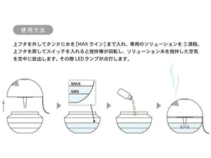タンクに水と専用のアロマソリューションを5滴ほど入れてスイッチオン!中の棒が回転しソリューション水と空気を撹拌。ホコリや臭い菌などを除いたきれいな空気を上部の穴から放出します。
