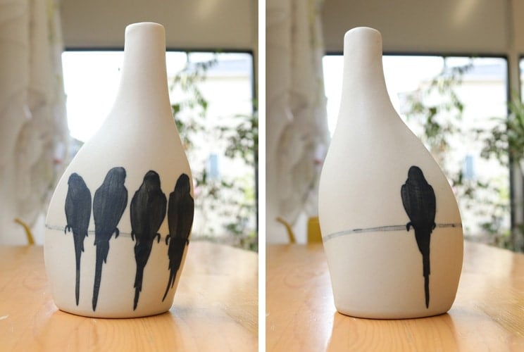 こちらの一輪挿しには、裏と表で異なる数のインコのシルエットが描かれています。最初は1羽だったインコにどんどん仲間が増え、4羽になりました。
